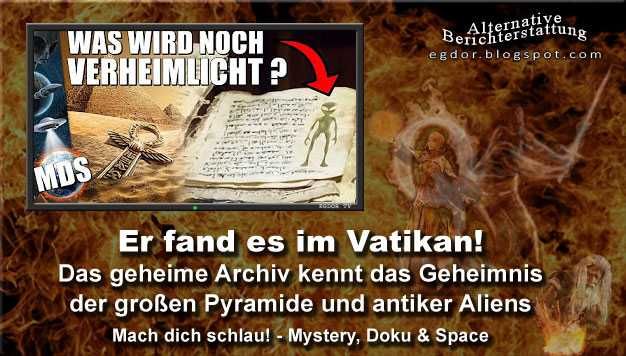 Er fand es im Vatikan! Das geheime Archiv kennt das Geheimnis der großen Pyramide und antiken Aliens – so sagt es ein russischer Wissenschaftler der in den geheimen Archiven des Vatikan war. Er habe dabei nicht nur das Geheimnis der Pyramiden in Ägypten enthüllt, sondern auch die Anwesenheit Außerirdischer auf der Erde. Antike Außerirdische also Ancient Aliens nahmen Einfluss auf die alten Kulturen. Gar den Bau eines UFO habe er dort gefunden. Alles dokumentiert in den Büchern des geheimen Archiv des Vatikan – eine unschätzbare Anhäufung an Wissen. Dies alles fand er im Vatikan und es kenne noch mehr als das Geheimnis der großen Pyramide und antiken Aliens