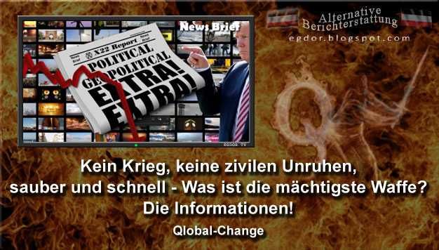Der Deep State baut jetzt das Narrativ auf, dass es zivile Unruhen bis hin zum Bürgerkrieg geben wird. Das wird nicht geschehen, auch wenn sie darauf hinarbeiten und es herbeikonstruieren wollen. Trump und die Patrioten kennen ihr Drehbuch, den Ablauf von Farbenrevolutionen. Es ist das gleiche Drehbuch wie sie es immer benutzt haben. Der Kampf beginnt und die wertvollste Waffe sind dabei die Informationen. Und die sind tödlicher als Gewehre oder Bomben. Und Q sagte uns in Post 22: Kein Krieg, keine zivilen Unruhen. Sauber und schnell.