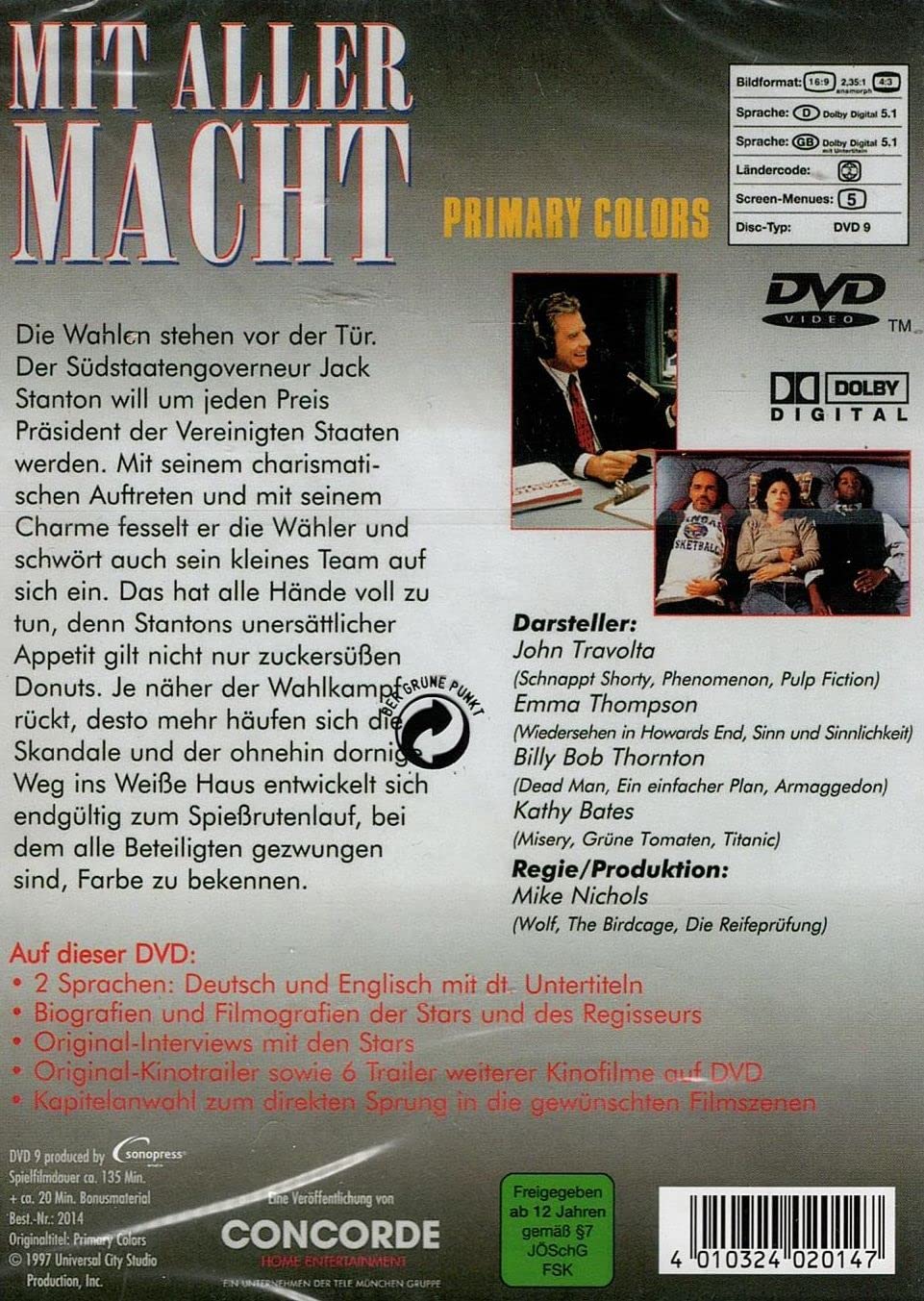 Filmname: Mit aller Macht – Primary Colors Originalname Film: Primary Colors (1998) Darsteller: John Travolta (Pulp Fiction, Schnappt Shorty und Nur Samstag Nacht), Emma Thompson (Sinn und Sinnlichkeit, Saving Mr. Banks mund Was vom Tage übrig blieb), Kathy Bates (Misery, Dolores und Titanic) Regie: Mike Nichols (Die Reifeprüfung, Hautnah und Wer hat Angst vor Virginia Woolf?) FSK: 12