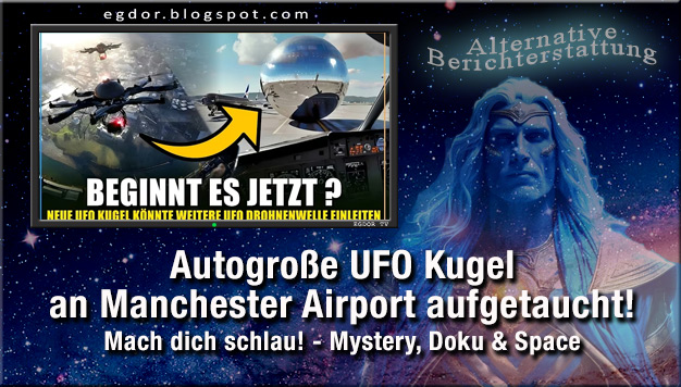 Autogroße UFO Kugel an Manchester Airport aufgetaucht – So die neueste Meldung aus Großbritannien – Erneut ist eine seltsame große Sphäre am Flughafen in Manchester aufgetaucht – Jenes unbekanntes Objekt, dass nach Meinung vieler die UFO Drohnenwelle in New Jersey eingeleitet hatte – Der Beginn der Alien Invasion im Jahr 2027 wie es Insider und Whistleblower vermuteten. Gibt es also eine Verbindung zwischen der unbekannten UFO Sphäre in Manchester und der weltweiten Drohnenwelle? Außerirdische Orbs und Kugeln die neben menschlichen Drohnen zu sehen waren?